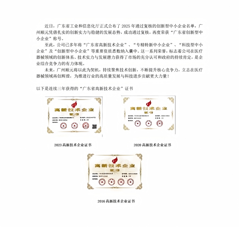 喜报!广州顺元再度获评“广东省创新型中小企业”